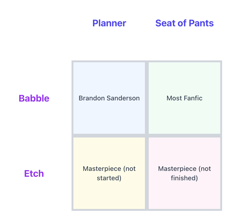 On a second axis of this Punnett square are the people who meticulously plan everything out ahead of time, such that when they start writing, they’re basically a printer; instantiating a design file which already exists. Contrast with the other type, who are flying by the seat of their pants, bushwhacking through their own plot and discovering the twists as they go.